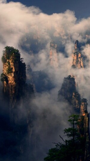 有时,山下细雨霏霏,山上却晴空万里 ;有时,山上云遮雾罩,山下却阳光灿烂。美国好莱坞大片《阿凡达》中的悬浮山,吸引了全世界观众的眼球,其原型就是云海中的武陵源石英砂岩峰林。晴朗的清晨,一轮朝阳在五彩云霞簇拥下,从奇山异峰中冉冉升起 ;