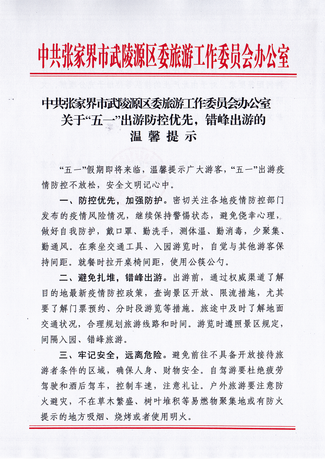 张家界武陵源景区关于“五一”出游防控优先,错峰出游的温馨提示
