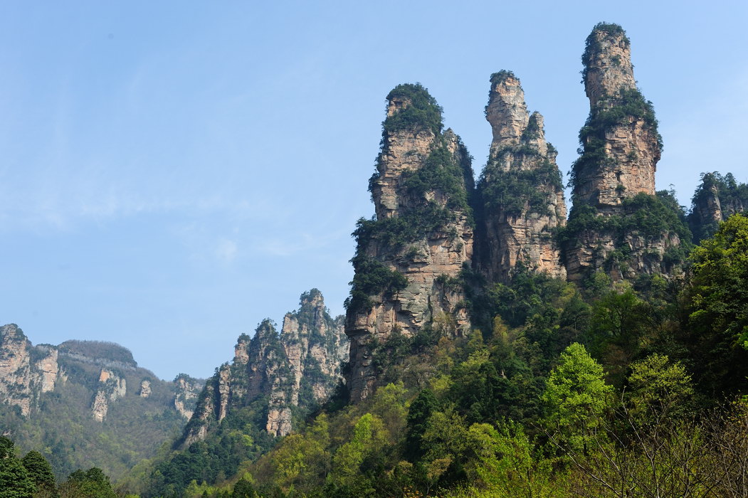 三姐妹峰位于十里画廊峡谷最深处,是十里画廊的精华景点之一。三根石峰并排矗立,活脱脱就是三个姐妹并排而立,左边的是大姐,身上背着一个孩子,中间的是二姐,怀里抱着一个孩子,右边的是小妹,刚刚结婚,肚子里怀着一个孩子。